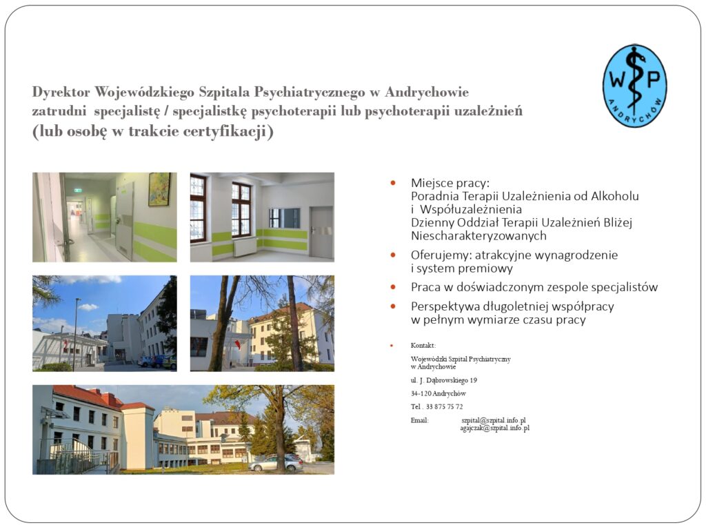 Wojewódzki Szpital Psychiatryczny w Andrychowie rozpoczął swoją działalność 1 lipca 1978 roku. 1 września 1998 roku zarządzeniem Wojewody Bielskiego został przekształcony w samodzielny publiczny zakład opieki zdrowotnej. Świadczy usługi w zakresie psychiatrii i leczenia odwykowego. Obecnie dyrektorem szpitala jest Piotr Kopijasz. Szpital zlokalizowany jest w Andrychowie, miasteczku położonym przy głównym węźle komunikacyjnym Bielsko-Biała – Kraków. Placówka otoczona jest pięknym parkiem, w którym spokój znajdują wszyscy pacjenci zakładu.